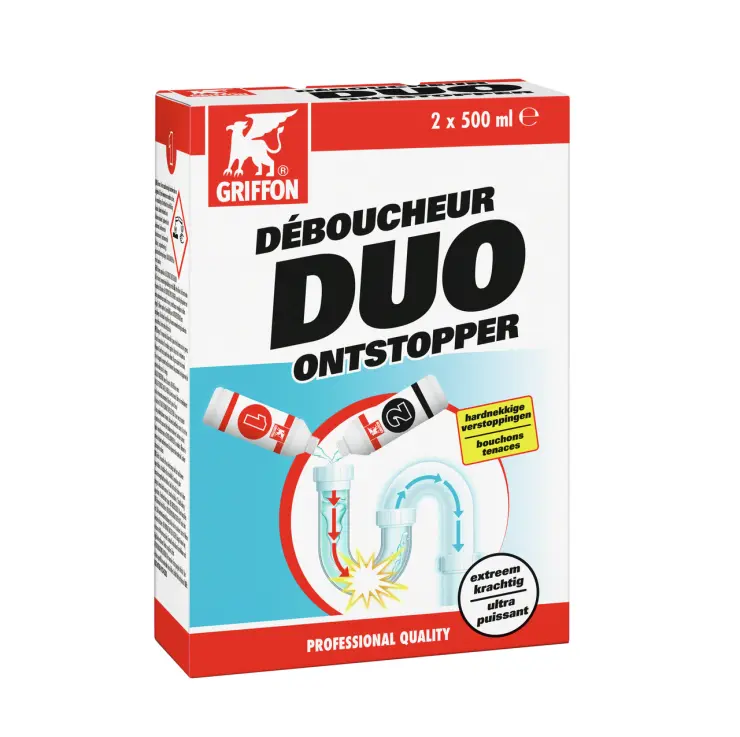 Remove as much water as possible from sink or washbasin. Carefully pour part 1 (see scale) of bottle 1 (red) into the drain. Screw the top back on the bottle. Carefully pour part 1 of bottle 2 (black) into the drain and allow the product to act for at least 1 hour. If the drain is difficult to clear, allow the product to work for 8 hours. Rinse with large amounts of hot water. Now pour part 2 of bottle 1 (red) into the drain. Pour part 2 of bottle 2 (black) into the drain and allow the product to act for 1 hour. Rinse with copious amounts of hot water.
