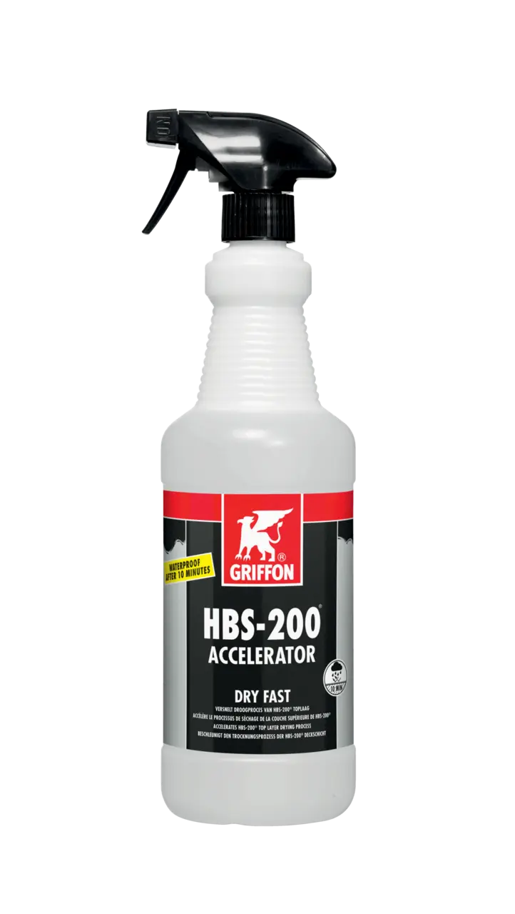 Spray Accelerator on the HBS-200® coating. HBS-200® is dry-to-touch 2 minutes after using Accelerator, can withstand light rain after 5 minutes, and is completely impervious to rainfall and water after 10 minutes. Make sure that HBS-200® is completely dry before applying a new HBS-200® layer. Use water to clean tools afterwards.