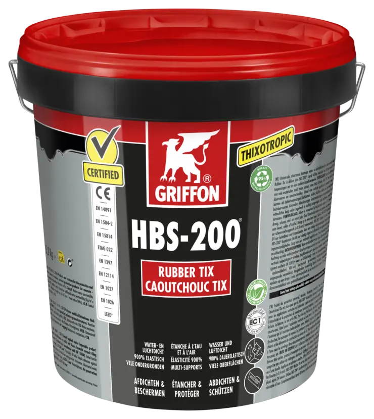 To only be used at temperatures above +5°C. Stir thoroughly by hand before use, do not use an electric mixer. After approximately 60 minutes a surface skin forms, which can be loaded with (light) rainfall after 4 hours. Completely waterproof after 24 hours. At lower temperatures and humid weather conditions, take longer drying times into account. It is strongly recommended not to spray HBS-200 Rubber Tix without wearing gloves, protective clothing, eye and face protection. If a joint sealant is used in combination with HBS-200® Liquid Rubber / Rubber Tix, we strongly recommend to use a neutral silicone sealant, for example GRIFFON S-200, to prevent discoloration of the sealant.