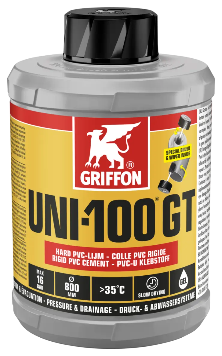 For joining pipes, sockets and fittings with interference fit and loose fit (gap filling) in pressure and drainage systems. With special pipe brush for quick and easy application. Extremely suitable for large diameters and at higher temperatures (> 35°C). Suitable for diameters ≤ 800 mm. Max. 16 bar (PN 16). Maximal tolerances 0.8 mm diametrical clearance / 0.2 mm press fit. Suitable for e.g. pipe systems conforming to EN 1329, 1452, 1453, 1455 and ISO 15493 (PVC).