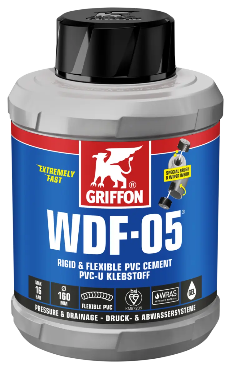 1. Cut pipes square, chamfer edges and deburr. 2. Clean surfaces with Griffon Cleaner and Cleaner Cloth. 3. Apply adhesive rapidly and evenly all around (4-6x) on both surfaces (pipe thickly, socket thinly). 4. Assemble joint immediately. Remove excess adhesive. Do not load the joint mechanically for the first 10 minutes. Close packaging immediately after use.
