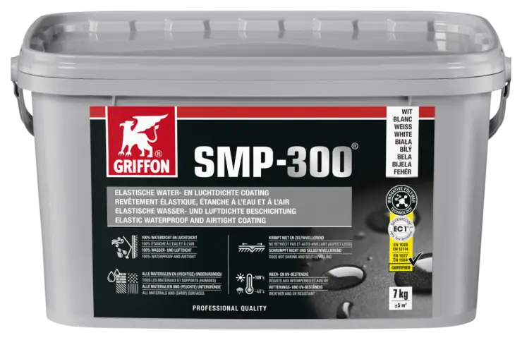 Open blik en breng een eerste laag aan met een kwast. Aanbrengen in 1 (Luchtdichte Constructies) of 2 (Waterdicht maken) lagen. Breng een eerste laag aan op het oppervlak met een kwast of roller. Gebruik GeoTextile van GRIFFON voor naad-, scheur- en scheuroverbruggende toepassingen. Druk het GeoTextile in de natte laag tot deze volledig verzadigd is met de coating. Breng een tweede laag SMP-300® aan binnen 1 uur (of in ieder geval voordat huidvorming optreedt) op de GeoTextile, of na volledige uitharding van de eerste laag (ongeveer 6 - 8 uur*). Strooi desgewenst leischilfers in de nog natte laag om een esthetisch geheel van het gehele dak te verkrijgen. *Coating hardt uit door de vochtigheid en het vocht in de ondergrond.