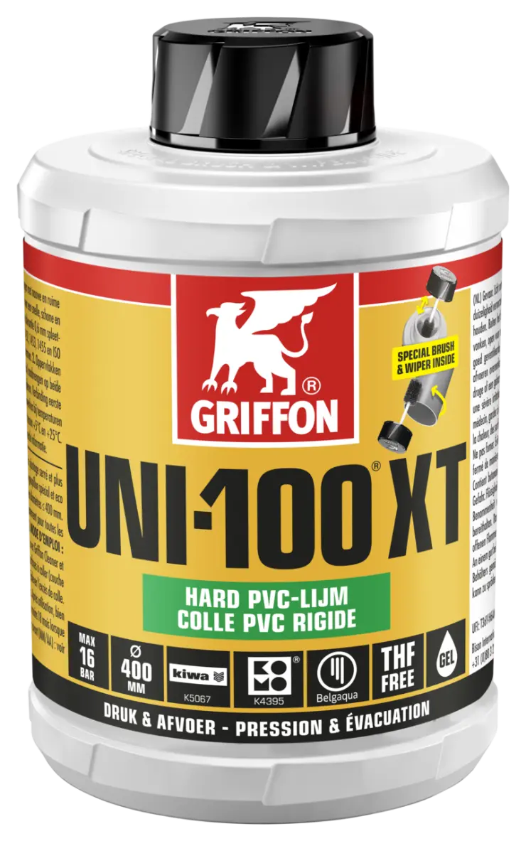 Voor het verlijmen van buizen, moffen en fittingen met nauwe en ruime passing (spleetvullend) in druk- en afvoersystemen. Met speciale borstel voor snelle en eenvoudige verwerking. Geschikt voor diameters ≤ 400 mm. Max. 16 bar (PN 16). Maximale tolerantie 0,6 mm spleetpassing / 0,2 mm perspassing. Geschikt voor o.a. leidingsystemen conform EN 1329, 1452, 1453, 1455 en ISO 15493 (PVC).