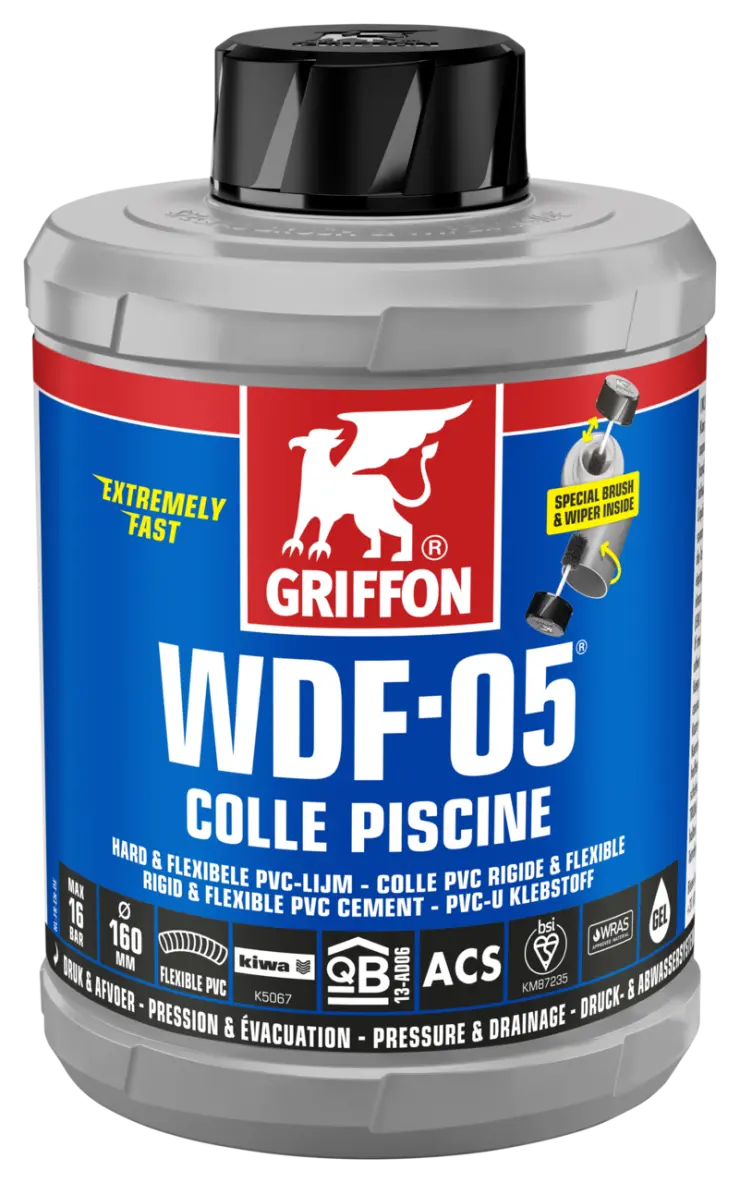 Voor het verlijmen van buizen, moffen en fittingen met nauwe en ruime passing (spleetvullend) in druk- en afvoersystemen. Uitermate geschikt voor flexibele slangen en toepassingen onder vochtige omstandigheden zoals bij o.a. zwembaden en whirlpools. Met speciale borstel voor snelle en eenvoudige verwerking. Geschikt voor diameters ≤ 160 mm. Max. 16 bar (PN 16). Maximale tolerantie 0,8 mm spleetpassing (flexibele slangen max. 0,3 mm) / 0,2 mm perspassing. Geschikt voor o.a. leidingsystemen conform EN 1329, 1452, 1453, 1455 en ISO 15493 (PVC).